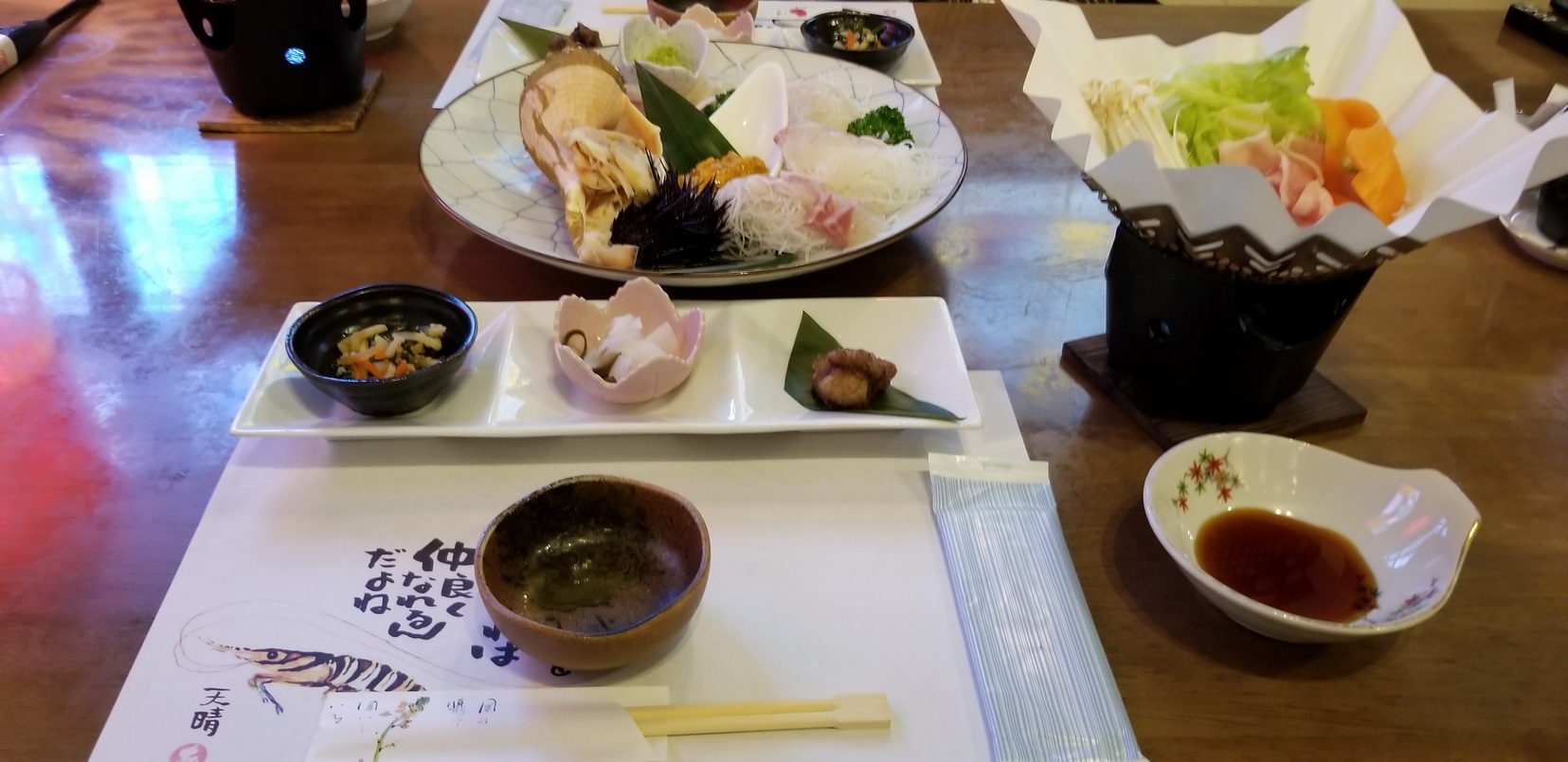 ↓旅館の食事。この前のえびのの旅館くらい出てきた。食べきれなかったけど、美味しかったです♪