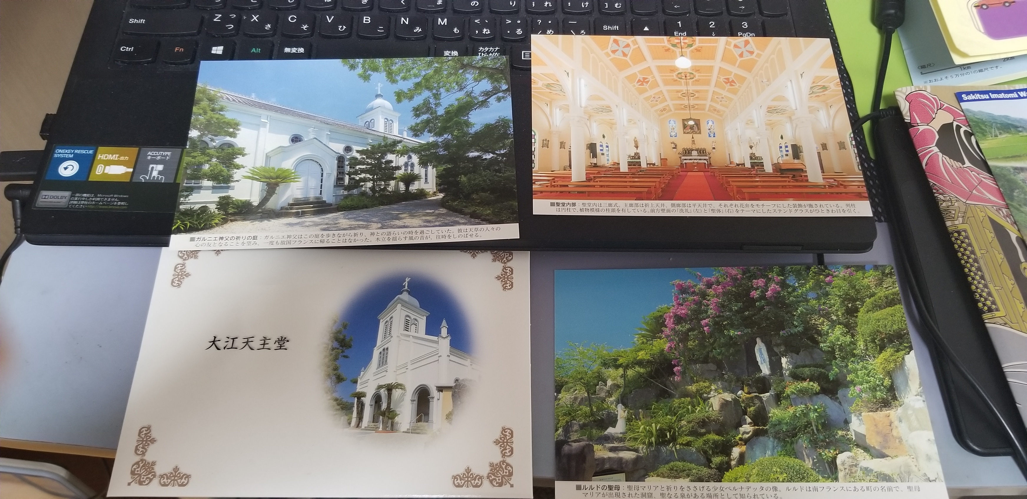 帰ってきてから、大江天主堂のポストカード見てたら。セツリが、この3枚パワーが凄いと言ってた。特に、右上の天主堂の中の写真が凄いって!部屋に飾ります♪