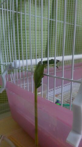じいちゃん家に行ったので、庭にたくさん生える明日葉貰ってきて、青音ちゃんにあげてみた~!ちゃんと、ネットでインコが食べれるのか調べました。この前、キャベツあげてみようとしたら、食べれないものに入ってたので;危ない;近づきもしなかったので、良かった(笑)明日葉は、籠に入れたら遠巻きに見つつも、すぐ寄ってきて、つついてたので、これはいける!と思いました。その後、ちょこちょこ食べてました。青音ちゃんは、好きなものだと、すぐ寄っていくので分かりやすい。おもちゃも、最初すぐ近づくものはずっと楽しそうに遊ぶし。近づかないのは、2週間経ったら慣れて遊びだしたりします。それも、その後はずっと遊ぶんだけどね(笑)